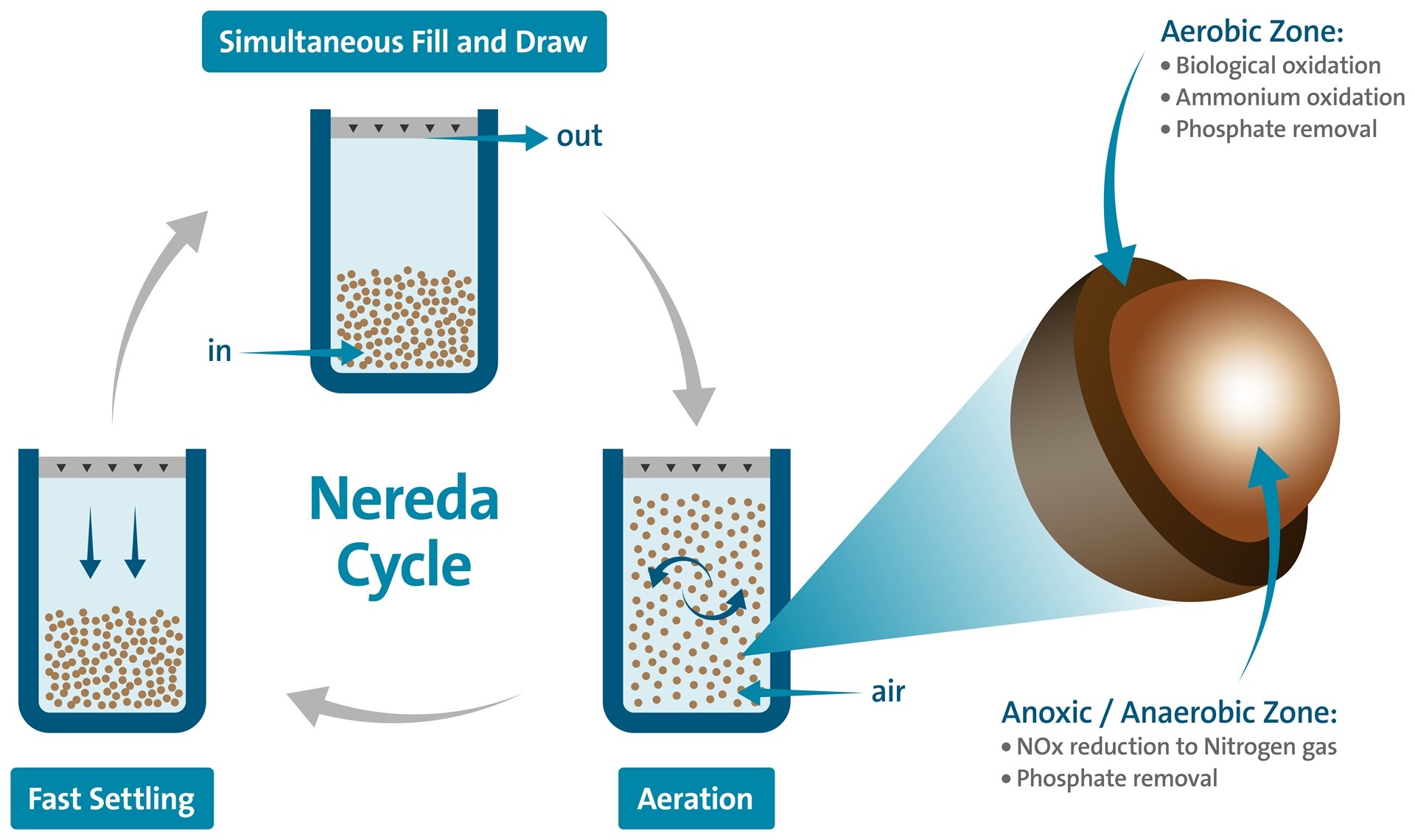 Nereda® is biological wastewater treatment. Within a Nereda® reactor, throughout a simple three-step cycle, the purifying biomass in Nereda® grows naturally as compact aerobic granular sludge, with superb settling properties. An important feature of the granules is that aerobic and anoxic/anaerobic zones co-exist. This enables a large variety of biological processes to happen simultaneously, like nitrification, denitrification and biological phosphate removal.
